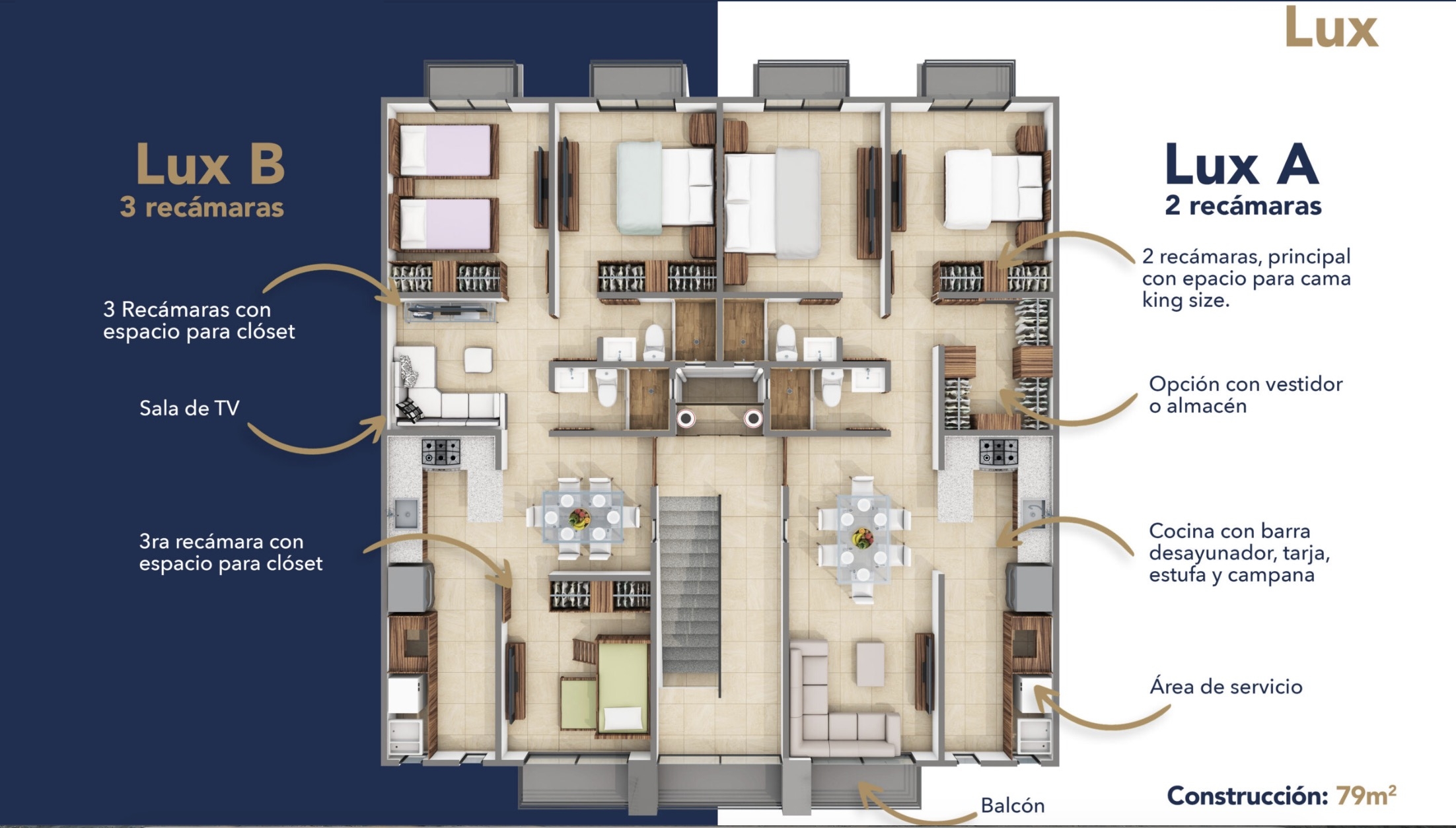 Modelo LUX con 79.48 m2 – configura tu depa con 2 recámaras y sala de tv ó 3 recamaras