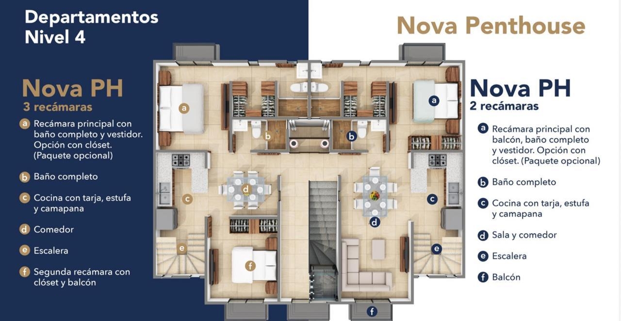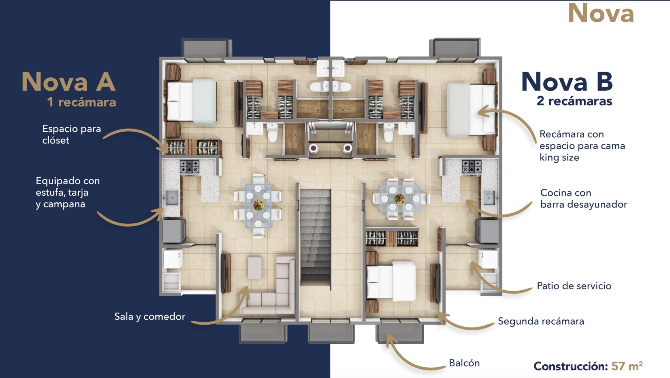 Modelo NOVA con 57.42 m2 – configura tu depa con 1 recámara y sala tv ó 2 recámaras