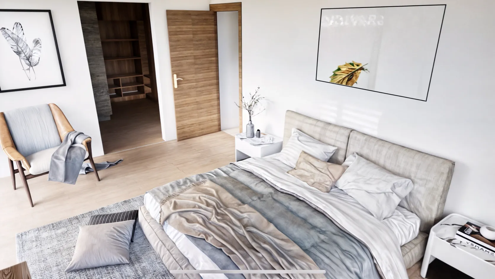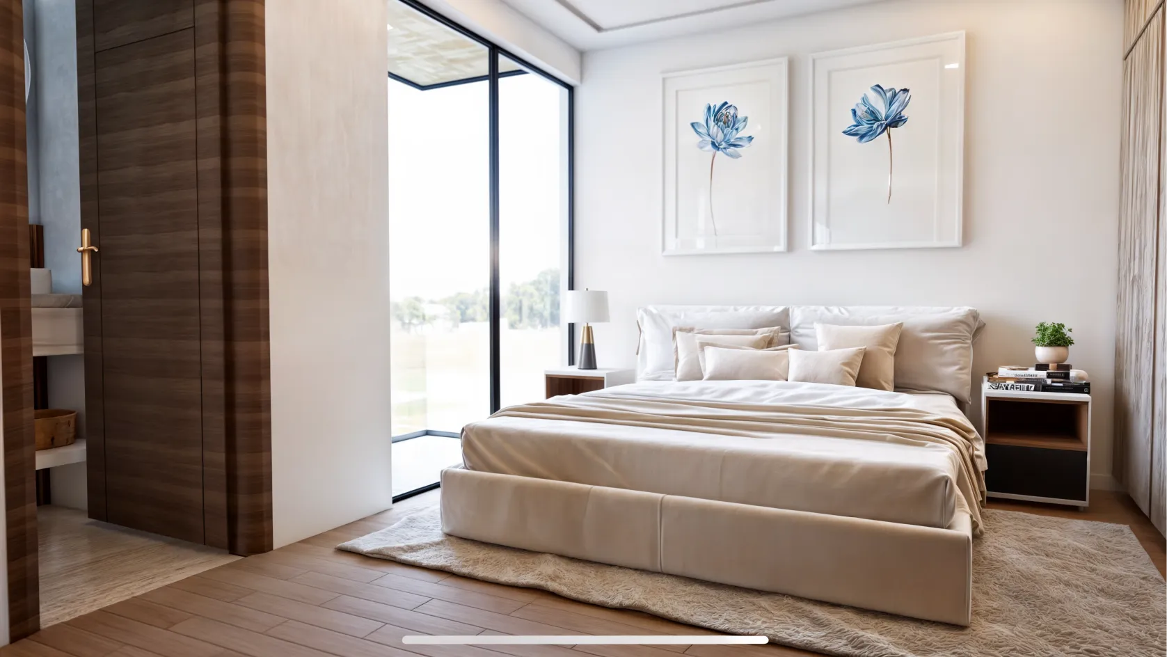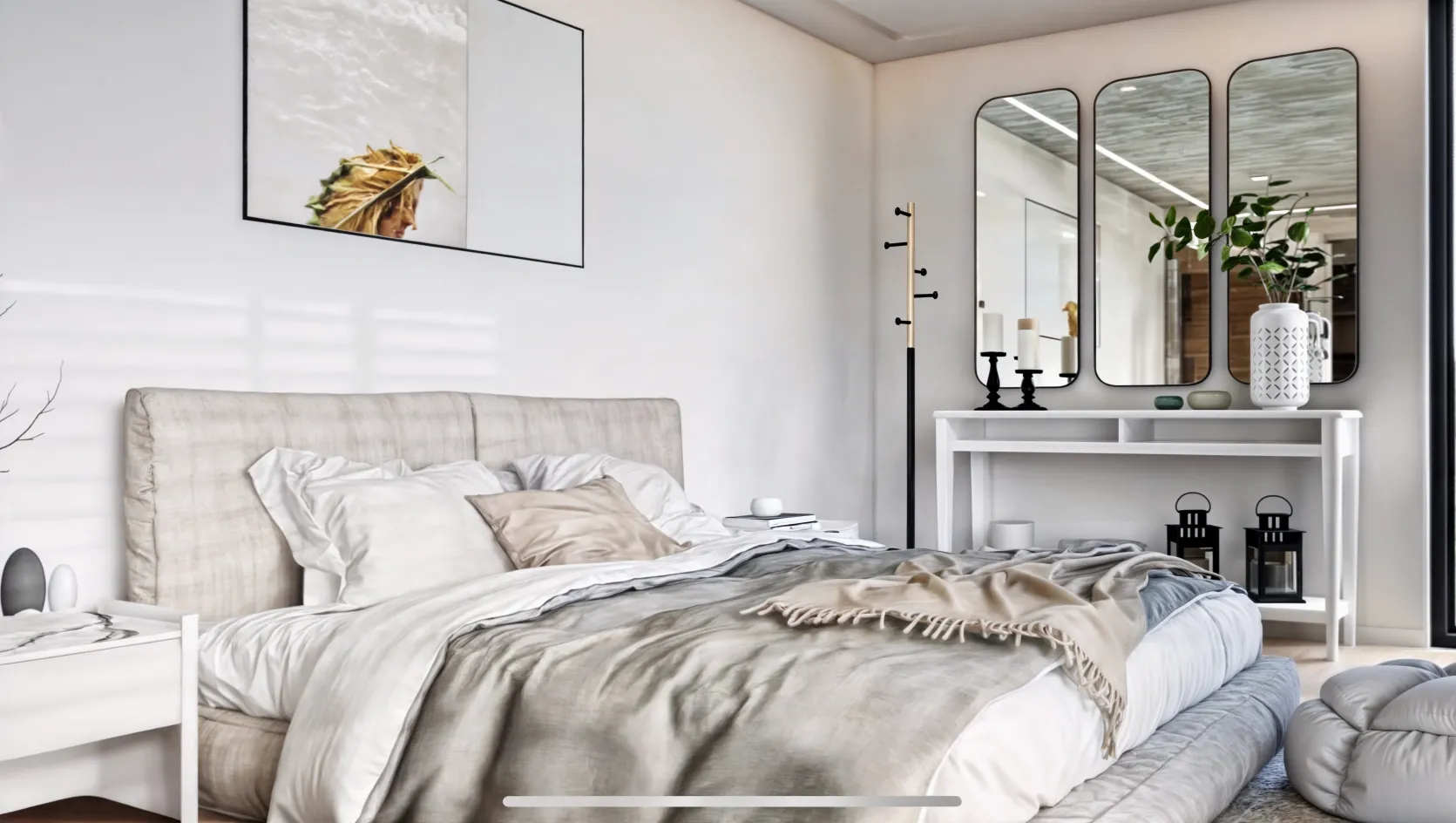 Estudio, dos recámaras con baño completo y balcón, recámara principal con terraza, vestidor, y baño privado equipado con dos ovalines.
