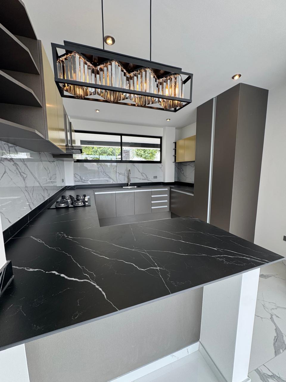 • Amplia cocina con parrilla, campana, horno, barra Sinterizada, alacena,