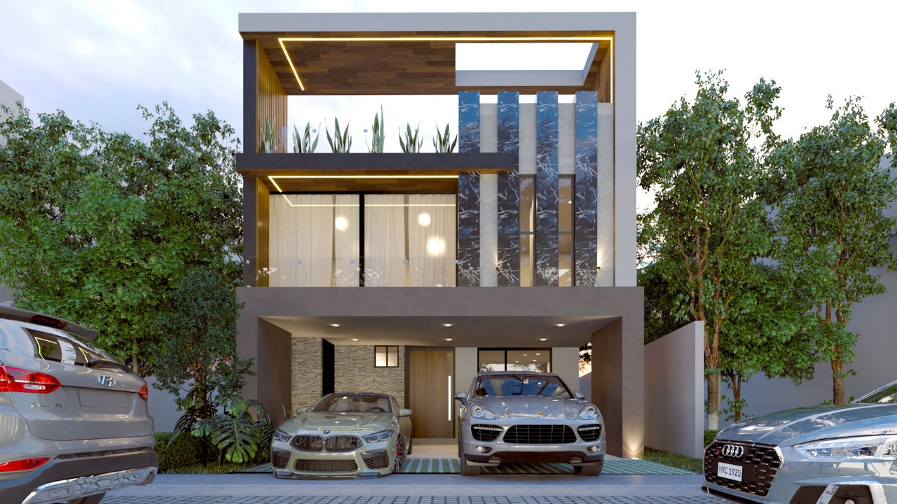Planta Baja: Cochera para 2 autos semitechada, cuarto de Máquinas, cisterna 10 mil litros, sala comedor, 1/2 baño visitas, cocina abierta totalmente equipada con torre de hornos, lavavajillas, alacena, pasillo de servidumbre lateral y 50m área de jardín.