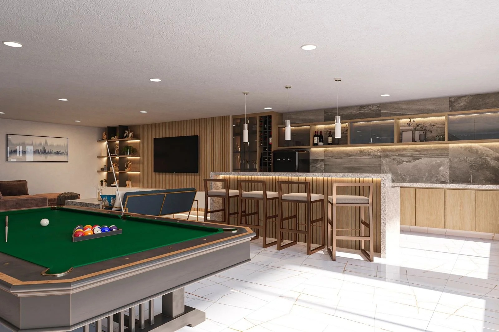 Area social con bar. cava y mueble de tv.