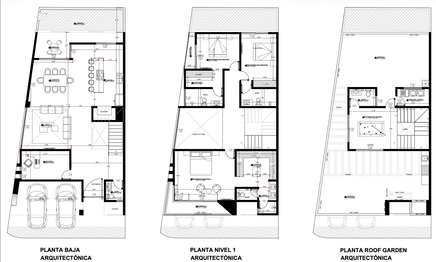 Planta Baja: estudio, medio baño, sala doble altura, comedor, cocina con isla.