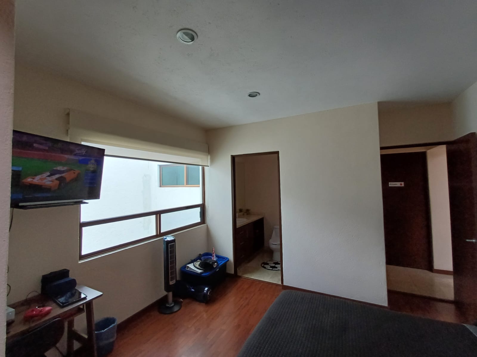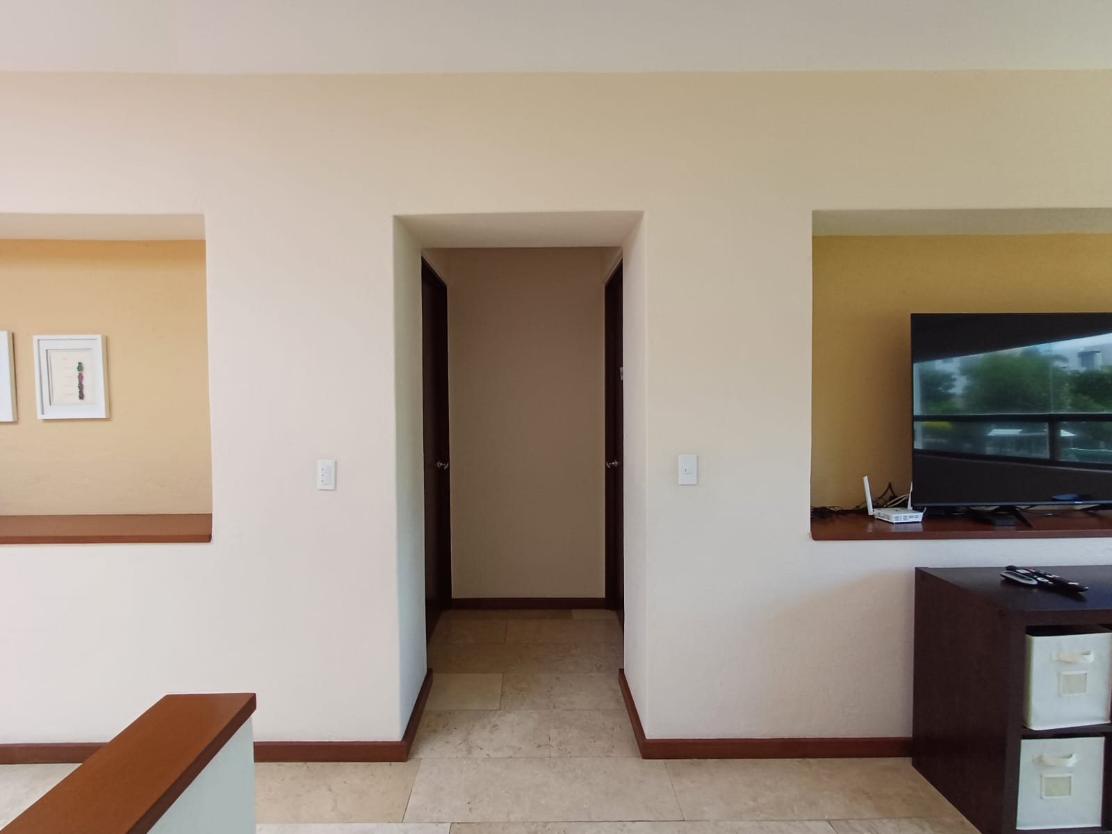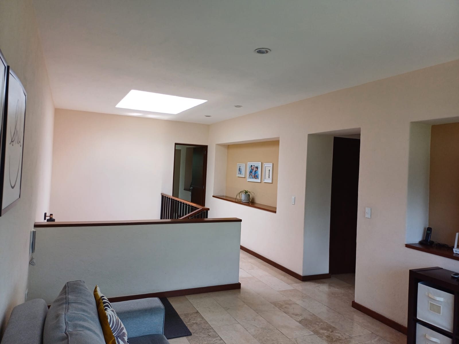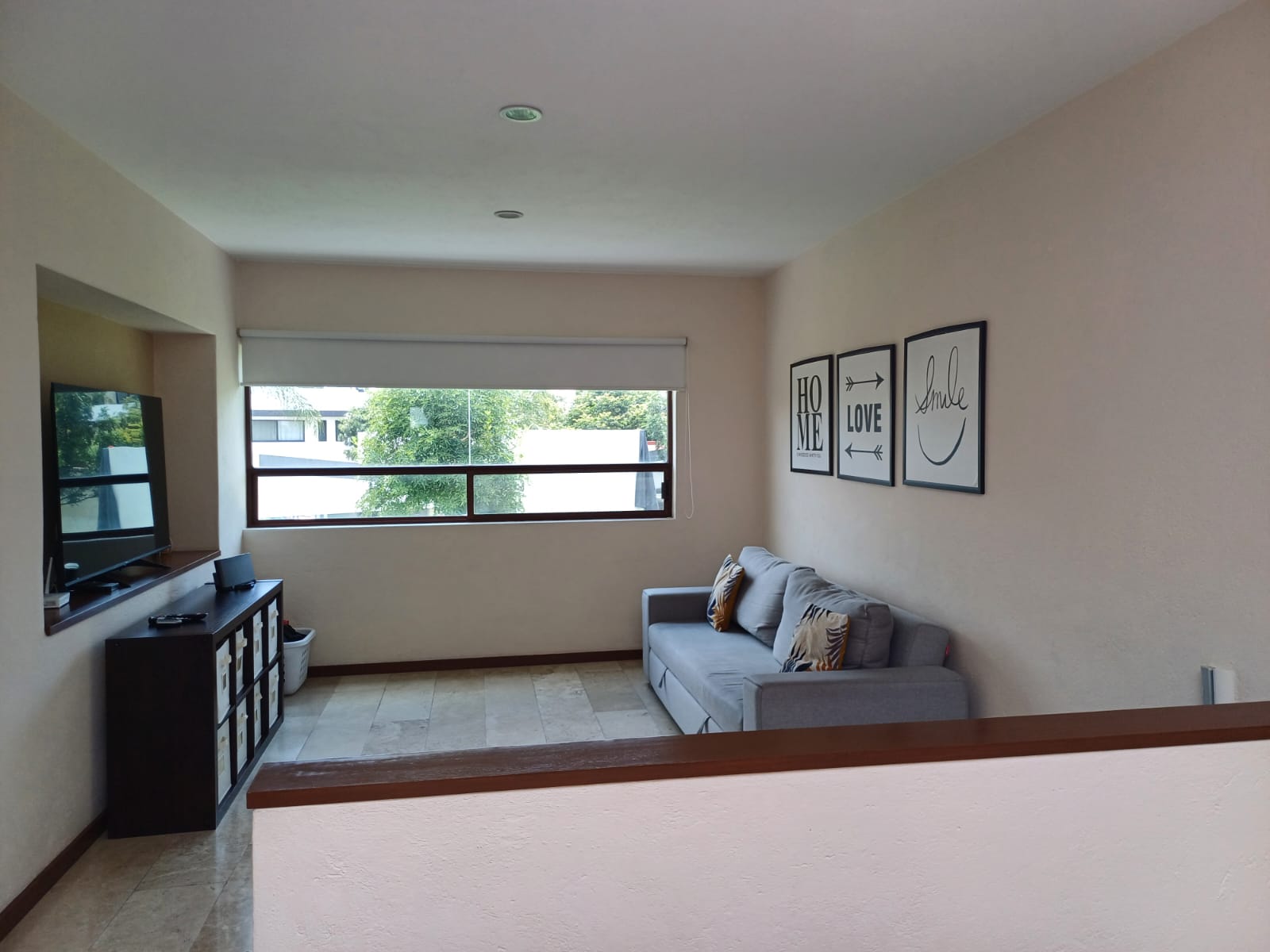 Amplia sala de TV, 3 recamaras con vestidor y baño completo y 2 con techo acabado de madera, en la recámara principal un estudio o Sala de TV.