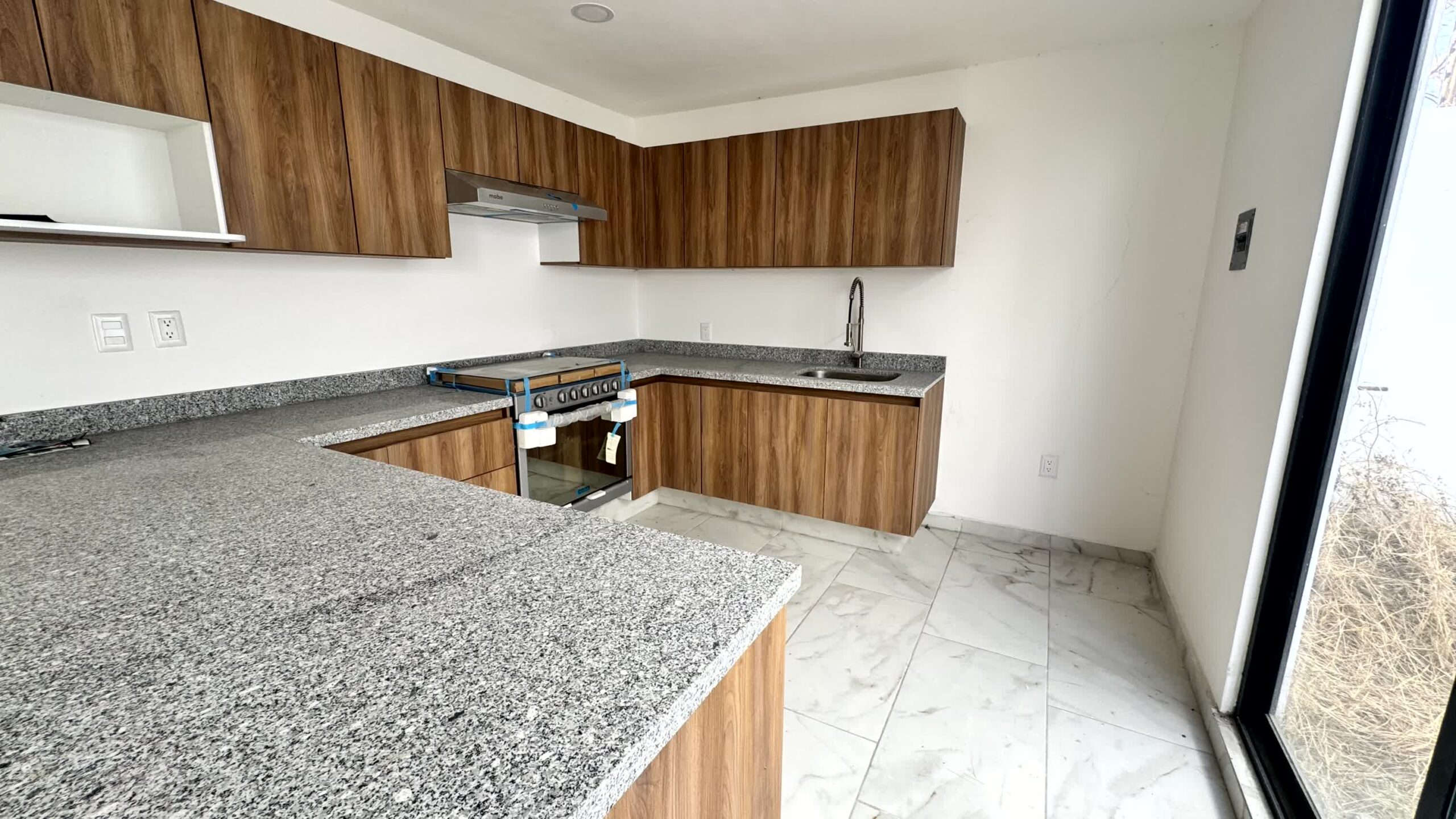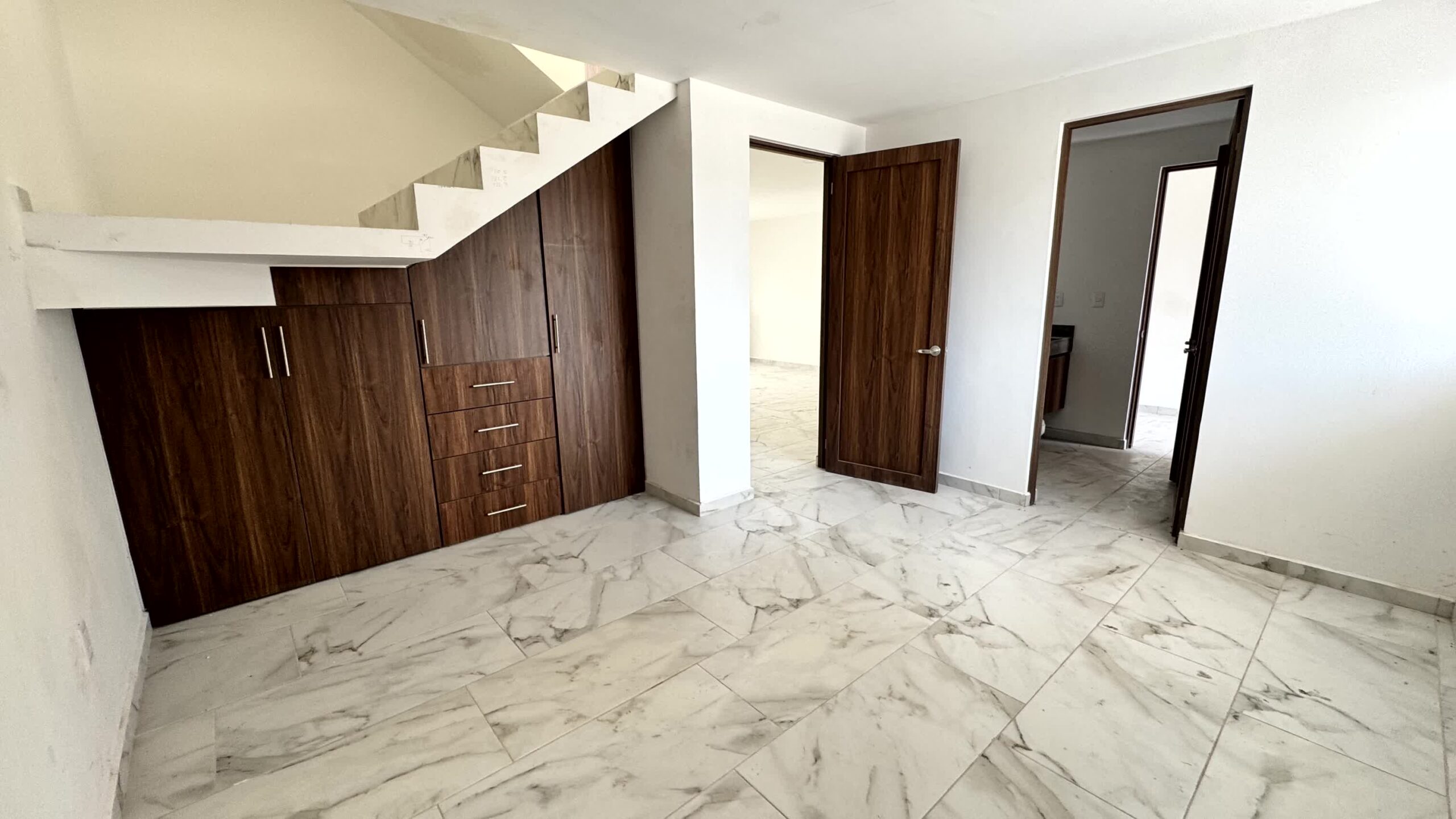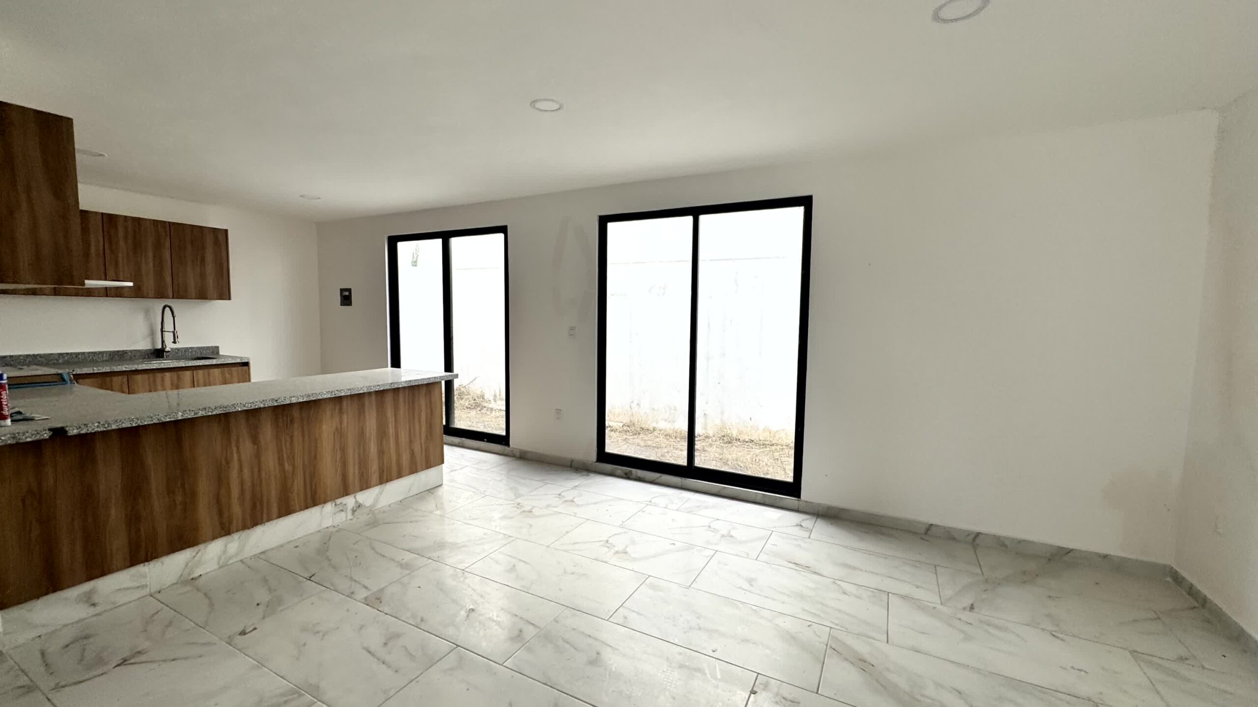 PB: cochera para 2 autos, recámara con baño completo, sala, comedor, cocina con barra desayunadora, jardín.